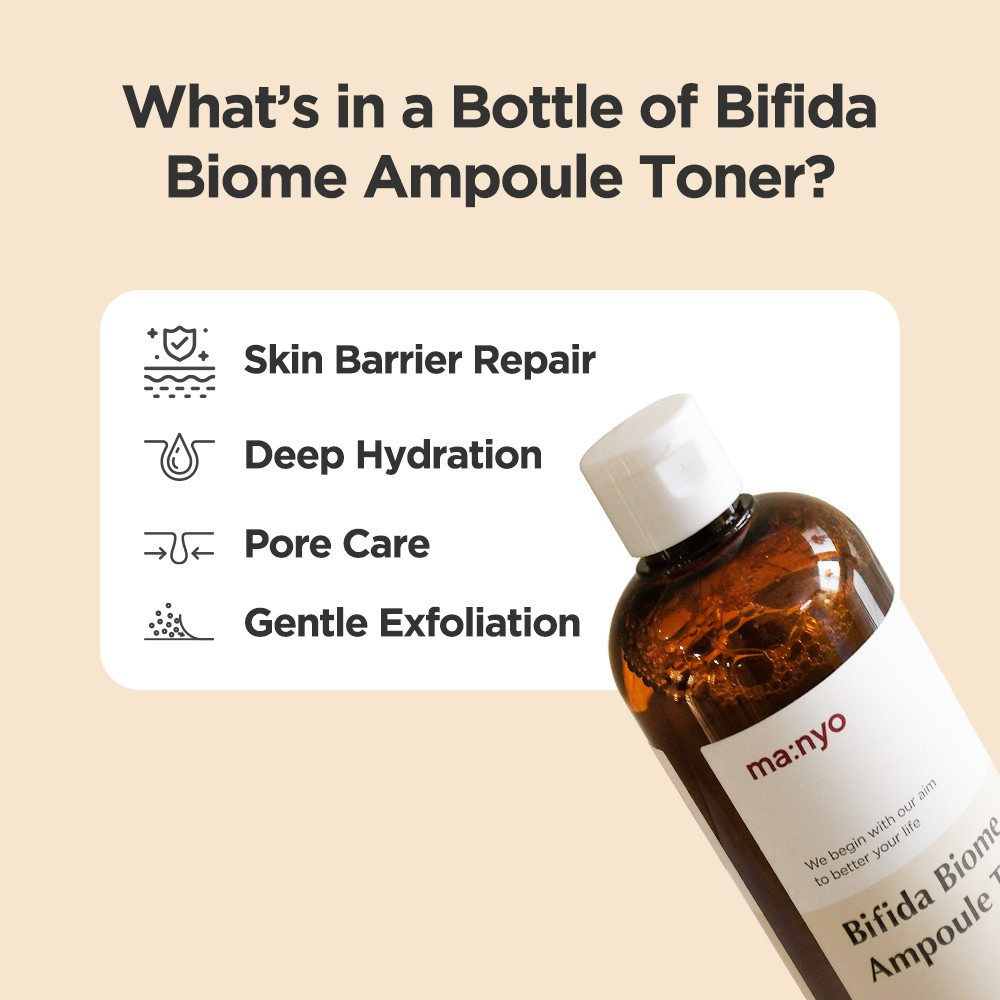 Ma:nyo Bifida Biome Ampoule Toner es un tónico facial multifunción que combina la ligereza de un tónico con la potencia de una ampolla, diseñado para hidratar, nutrir y fortalecer la barrera cutánea.