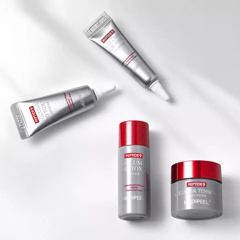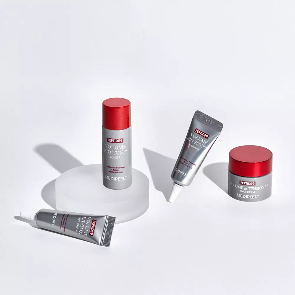 MEDIPEEL+ Peptide 9 Volume Bio Tox Trial Kit es un set de cuidado de la piel antienvejecimiento en tamaño de viaje que contiene cuatro productos esenciales para nutrir, reafirmar y revitalizar la piel, con el objetivo de reducir las arrugas y mejorar la elasticidad.